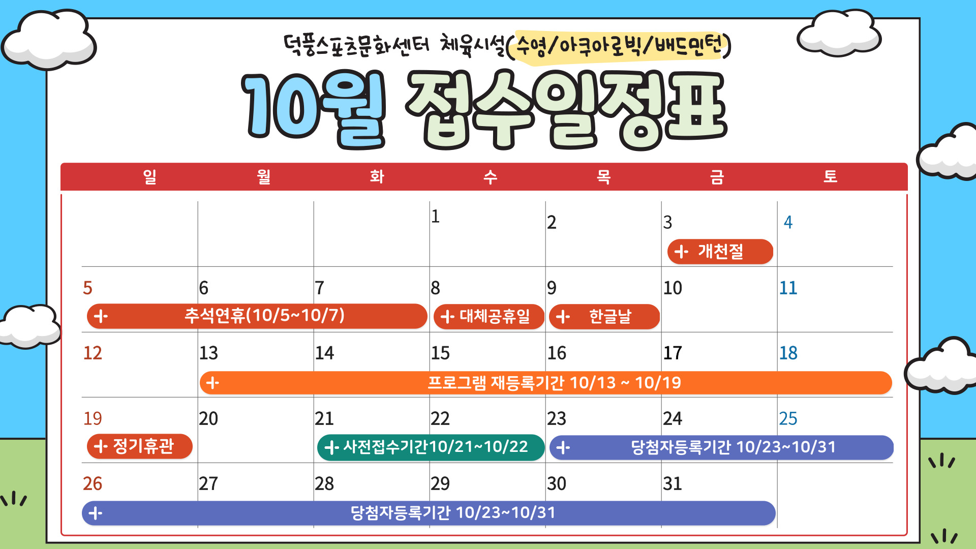 안녕하십니까.덕풍스포츠문화센터입니다.9월 프로그램 추첨 당첨 결과를 첨부파일로 공지하오니 확인하시기 바랍니다.○ 등록기간 : 2025. 9. 25.(목) 발표 이후 ~ 9. 30.(화) 21:00- 방문접수 시간: 월~금: 06:00~21:00 토,일: 09:00~17:00- 주말 점심시간(오후 12시부터 오후 1시까지)은 등록 불가합니다.- 등록기간 내 미등록 시, 당첨이 취소됨을 알려드립니다.○ 등록방법 : 방문등록(카드결제)- 덕풍스포츠문화센터 1층 안내데스크에서 등록 진행합니다.- 수강료 및 이용료 결제는 카드결제만 가능합니다. (현금결제 불가)- 방문등록만 가능합니다.(온라인, 전화 등 다른 방법 불가) ○ 주민등록 상 관외(하남시 외) 거주자는 추첨접수 및 당첨 취소○ 프로그램 등록 시 필요서류1. 하남시민 : 신분증2. 초등학생 등록자, 다자녀할인 적용대상자 : 주민등록등본3. 관외자 중 관내 재직자일 경우: 신분증, 사업자등록증, 건강보험자격득실확인서4. 관외자 중 관내 사업자일 경우: 신분증, 사업자등록증해당하는 증빙서류를 지참하시어 방문하시기 바랍니다.○ 성인 및 초등생 강습수영 안내개인 진도에 맞지 않는 수영 강습 등록자일 경우, 수업을 수강할 수 없으며 중도 환불처리가 될 수 있습니다.