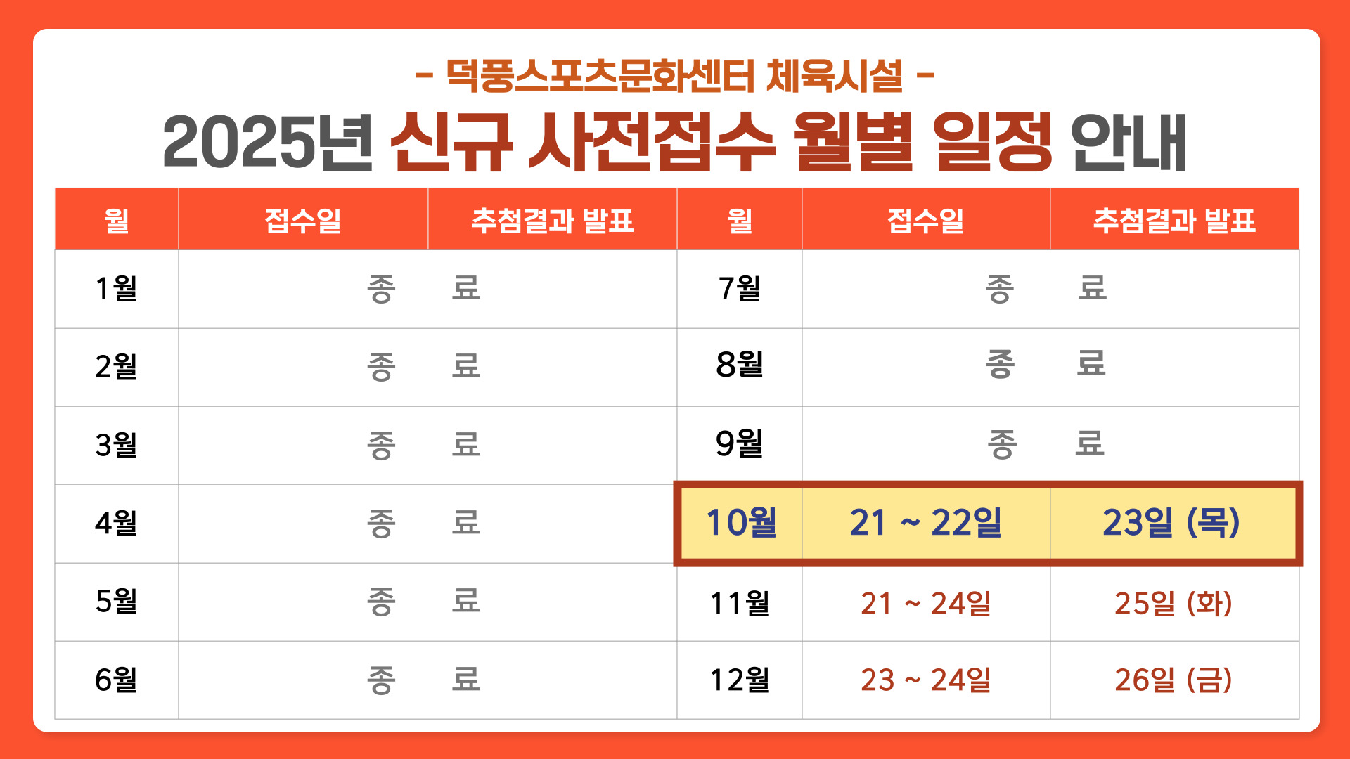 안녕하십니까.덕풍스포츠문화센터입니다.9월 개인사물함 추첨결과 및 번호를 배정하오니 첨부파일을 확인하시기 바랍니다.○ 등록기간 : 2025. 9. 25.(목) 발표 이후 ~ 9. 30.(화) 17:00- 방문접수 시간: 월~금: 06:00~21:00 토,일: 09:00~17:00- 주말 점심시간(오후 12시부터 오후 1시까지)은 등록 불가합니다.- 등록기간 내 미등록 시, 당첨이 취소됨을 알려드립니다.○ 등록방법 : 방문등록(카드결제)- 덕풍스포츠문화센터 1층 안내데스크에서 등록 진행합니다.- 이용료 결제는 카드결제만 가능합니다. (현금결제 불가)- 방문등록만 가능합니다.(온라인, 전화 등 다른 방법 불가) ○ 대여한 사물함은 타인에게 양도가 불가합니다.- 양도, 대여, 매매 등 부정행위 적발 시 즉시 반환처리 및 재등록 불가