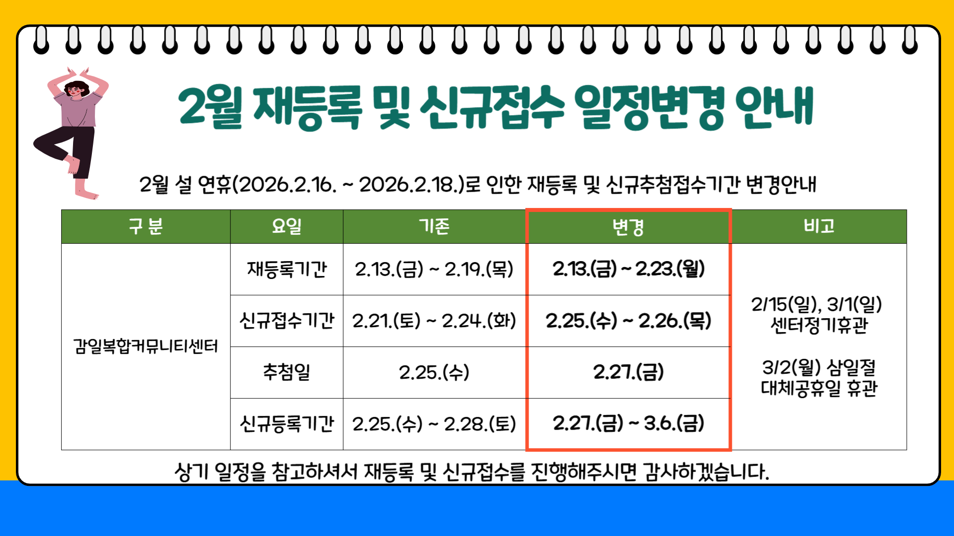 안녕하십니까.감일복합커뮤니티센터입니다.2026년 2월 프로그램 추첨 당첨 결과를 첨부파일로 공지하오니 확인하시기 바랍니다.○ 등록기간: 2026. 1. 23.(금) 발표 이후 ~ 1. 31.(토) 21:00- 방문접수 시간: 월~금: 06:00~21:00 토, 일: 09:00~17:00- 주말 점심시간(오후 12시 30분부터 오후 1시 30분까지)은 등록 불가합니다.- 등록기간 내 미등록 시, 당첨이 취소됨을 알려드립니다.○ 등록장소: 감일복합커뮤니티센터 1층 안내데스크○ 등록방법: 방문등록(카드결제) - 수강료 및 이용료 결제는 카드결제만 가능합니다. (현금결제 불가) - 방문등록만 가능합니다.(온라인, 전화 등 다른 방법 불가) ○ 주민등록 상 관외(하남시 외)거주자는 추첨접수 및 당첨 취소○ 프로그램 등록 시 필요서류 1. 하남시민: 신분증 2. 초등학생 등록자, 다자녀할인 적용대상자 : 주민등록등본 3. 관외자 중 관내 재직자일 경우: 신분증, 사업자등록증, 건강보험자격득실확인서 4. 관외자 중 관내 사업자일 경우: 신분증, 사업자등록증 해당하는 증빙서류를 지참하시어 방문해 주시기 바랍니다.○ 성인 및 초등생 강습수영 안내 개인 진도에 맞지 않는 수영 강습 등록자일 경우, 수업을 수강할 수 없으며 중도 환불처리가 될 수 있습니다.문의전화: 031-690-9000