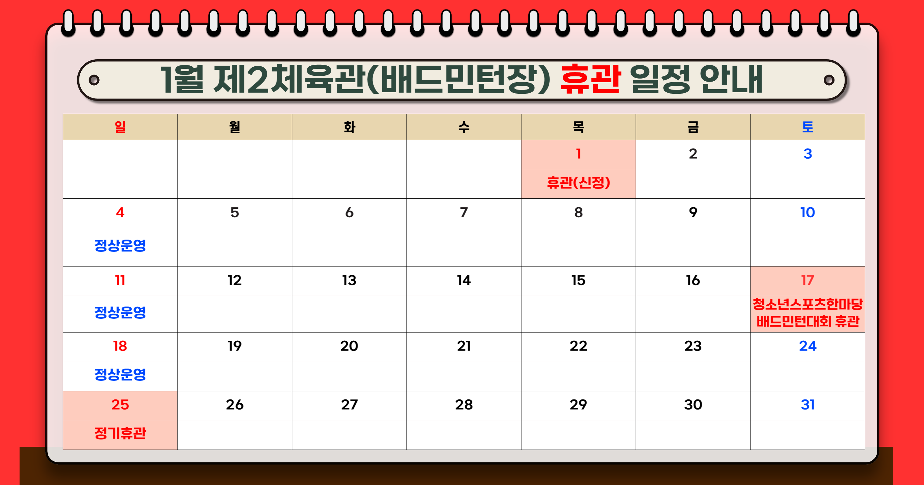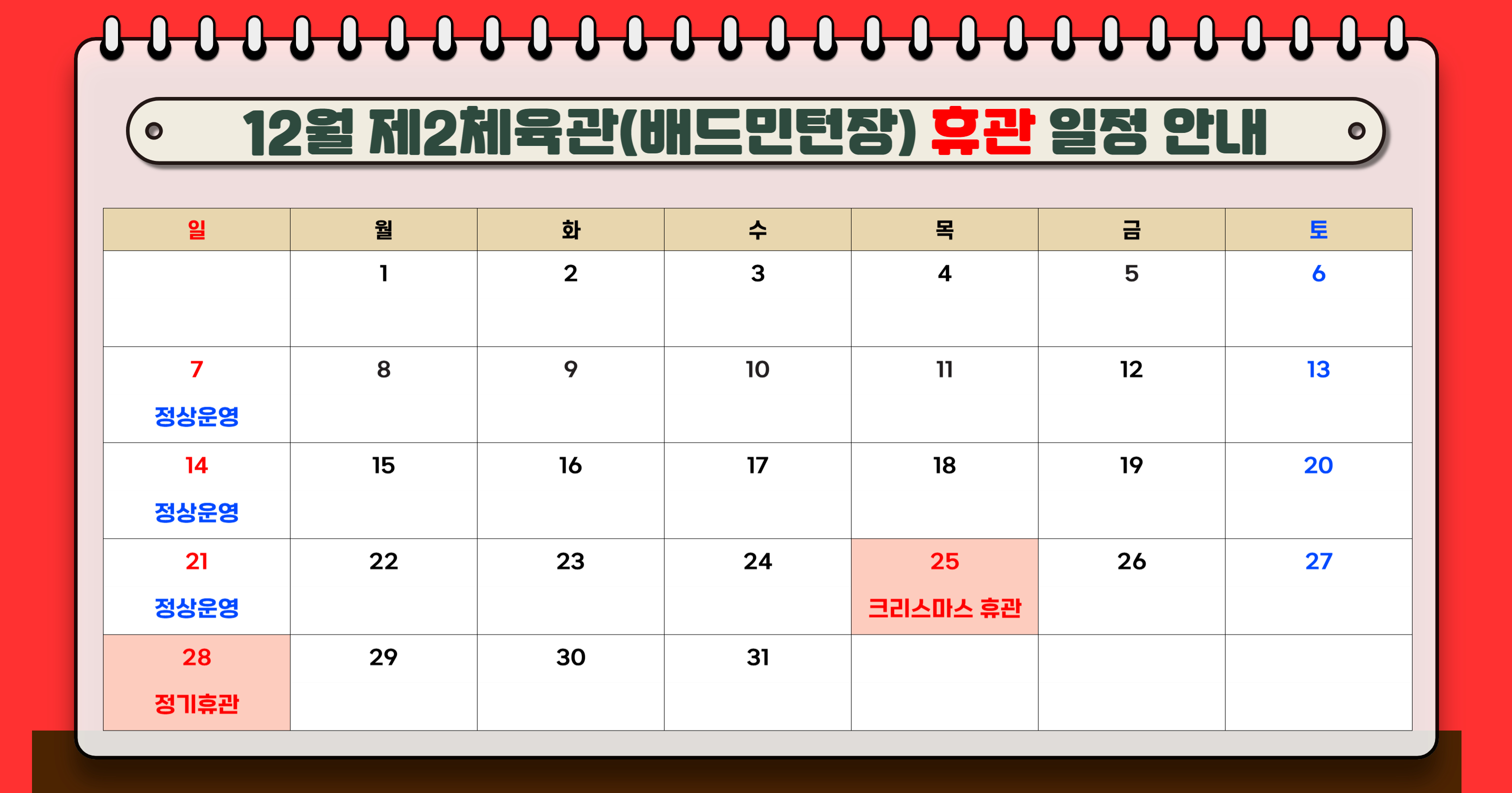 휴관- 하남국민체육센터 1,3째주 일요일 휴관