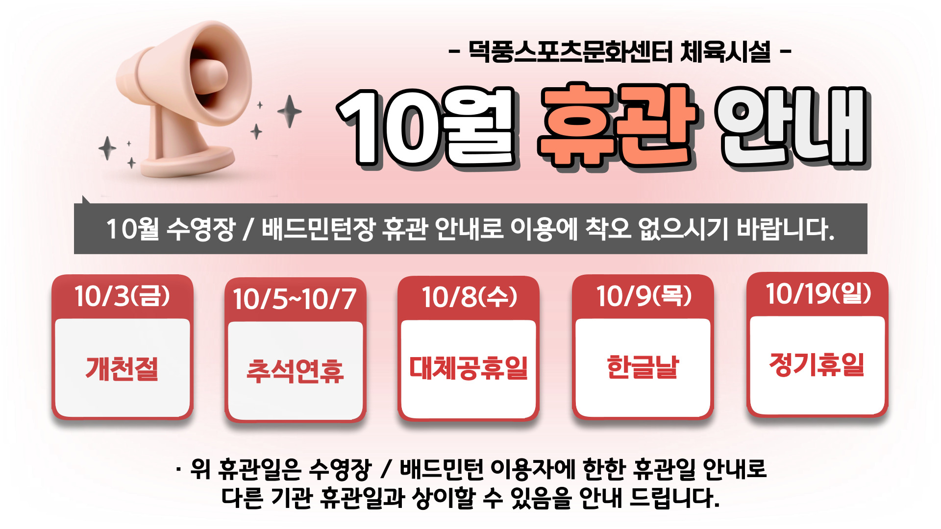 안녕하십니까.덕풍스포츠문화센터입니다.9월 개인사물함 추첨결과 및 번호를 배정하오니 첨부파일을 확인하시기 바랍니다.○ 등록기간 : 2025. 9. 25.(목) 발표 이후 ~ 9. 30.(화) 17:00- 방문접수 시간: 월~금: 06:00~21:00 토,일: 09:00~17:00- 주말 점심시간(오후 12시부터 오후 1시까지)은 등록 불가합니다.- 등록기간 내 미등록 시, 당첨이 취소됨을 알려드립니다.○ 등록방법 : 방문등록(카드결제)- 덕풍스포츠문화센터 1층 안내데스크에서 등록 진행합니다.- 이용료 결제는 카드결제만 가능합니다. (현금결제 불가)- 방문등록만 가능합니다.(온라인, 전화 등 다른 방법 불가) ○ 대여한 사물함은 타인에게 양도가 불가합니다.- 양도, 대여, 매매 등 부정행위 적발 시 즉시 반환처리 및 재등록 불가