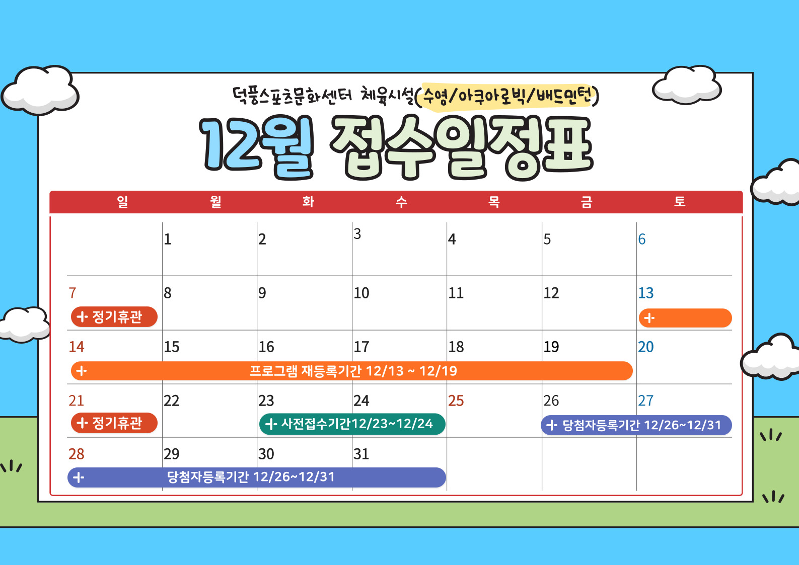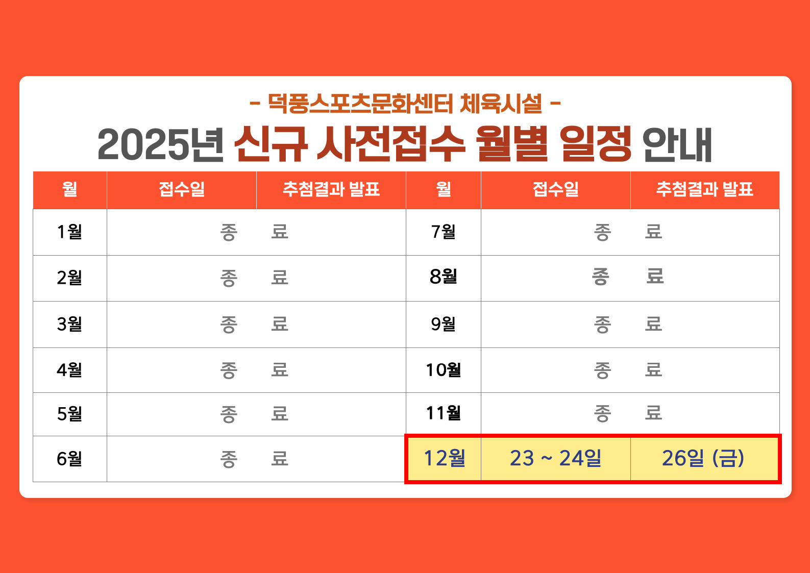 안녕하십니까.덕풍스포츠문화센터입니다.12월 프로그램 추첨 당첨 결과를 첨부파일로 공지하오니 확인하시기 바랍니다.○ 등록기간 : 2025. 11. 25.(화) 발표 이후 ~ 11. 29.(토) 17:00 - 방문접수 시간: 월~금: 06:00~21:00 토: 09:00~17:00 - 주말 점심시간(오후 12시부터 오후 1시까지)은 등록 불가합니다. - 등록기간 내 미등록 시, 당첨이 취소됨을 알려드립니다.○ 등록방법 : 방문등록(카드결제) - 덕풍스포츠문화센터 1층 안내데스크에서 등록 진행합니다. - 수강료 및 이용료 결제는 카드결제만 가능합니다. (현금결제 불가) - 방문등록만 가능합니다.(온라인, 전화 등 다른 방법 불가) ○ 주민등록 상 관외(하남시 외) 거주자는 추첨접수 및 당첨 취소○ 프로그램 등록 시 필요서류 1. 하남시민 : 신분증 2. 초등학생 등록자, 다자녀할인 적용대상자 : 주민등록등본 3. 관외자 중 관내 재직자일 경우: 신분증, 사업자등록증, 건강보험자격득실확인서 4. 관외자 중 관내 사업자일 경우: 신분증, 사업자등록증 해당하는 증빙서류를 지참하시어 방문하시기 바랍니다.○ 성인 및 초등생 강습수영 안내개인 진도에 맞지 않는 수영 강습 등록자일 경우, 수업을 수강할 수 없으며 중도 환불처리가 될 수 있습니다.