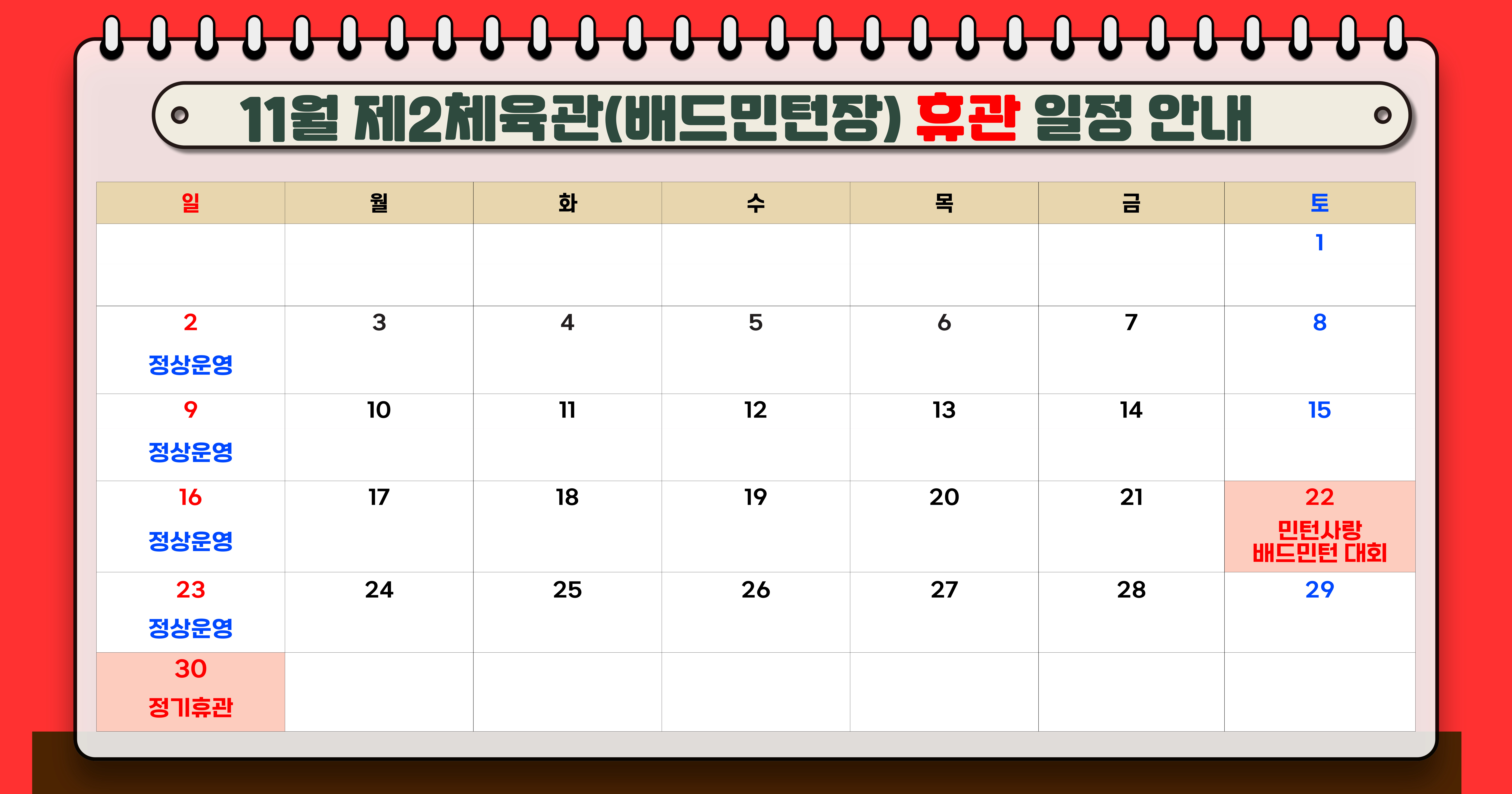 안녕하십니까, 하남종합운동장입니다.11월 하남종합운동장 대관 관련 일정 및 추석 휴관에 대하여 안내 드립니다.[11월 대관 일정] 11월 축구장, 다목적체육관 1. 우선 예약일 : 10월 13일 10시 2. 일반 예약일 : 10월 15일 10시 11월 테니스장, 야구장 1. 우선 예약일 : 10월 20일 10시 2. 일반 예약일 : 10월 22일 10시 ※ 우선 예약 기간동안 각 구장(코트) 별로 최대 2회 신청 가능. ※ 대관 신청 후 6시간 안에 온라인 카드 결제 미진행시 시스템 상으로 자동 취소. ※ 11월부터 잔디 보호를 위해 잔디구장 사용 불가.[추석 휴관 안내(대관)] 1. 다목적체육관 : 10.3(금), 10.5(일)~10.9(목) 휴관. 2. 그외 실외 체육시설 : 10.6(월) 추석 당일만 휴관. ※ 연휴기간동안 위의 날짜를 제외한 대관 시설 대관 이용은 가능하나 문의 응대는 불가능한 점 양해 부탁드립니다.문의 사항이 있으시면 031-790-2016으로 전화 부탁드립니다.항상 대관 운영 협조에 감사드립니다.