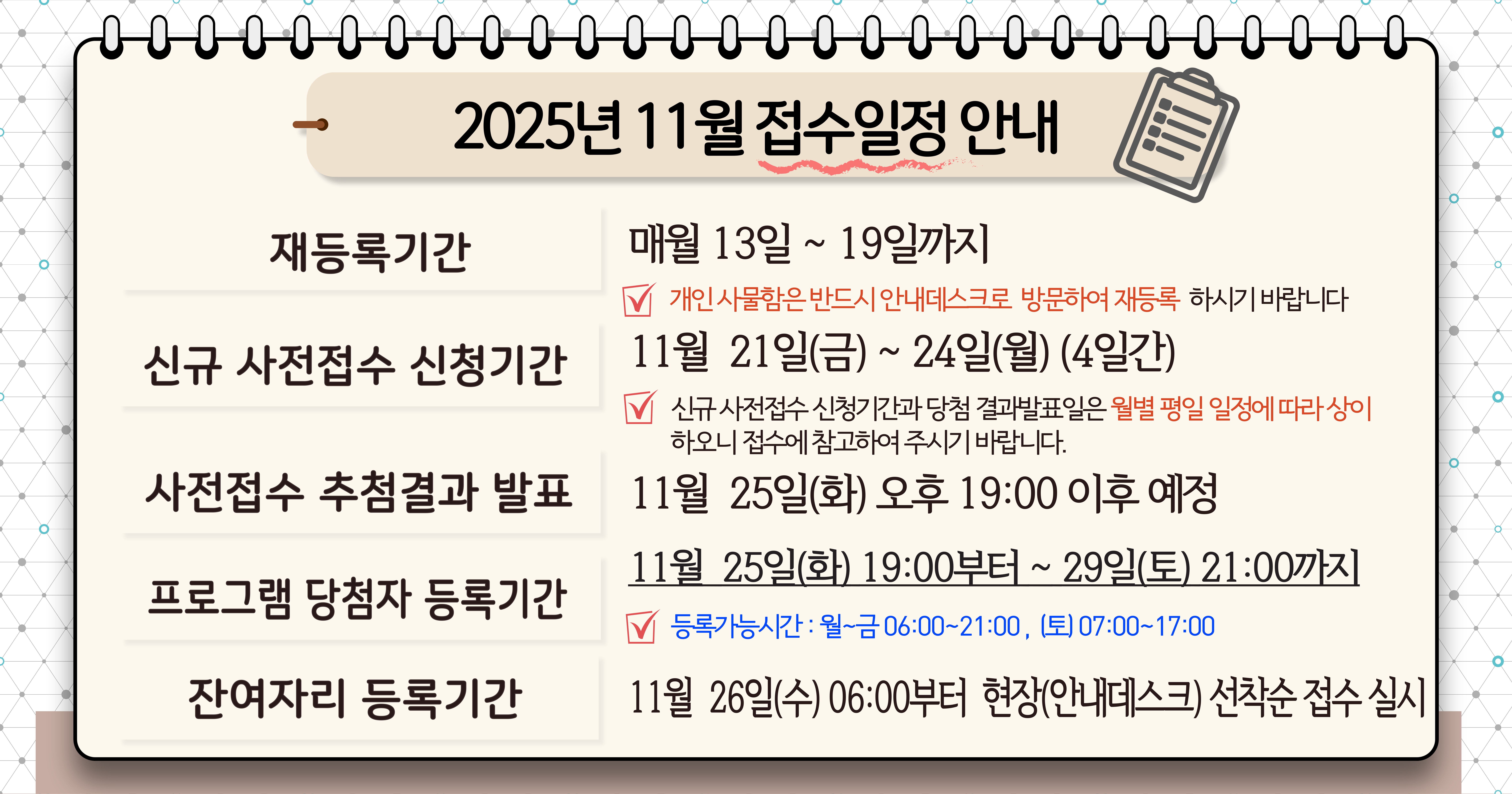 [하남종합운동장 국민체육센터]- 등록기간 : 10월 23일(목) 발표직후 ~ 10월 31일(금), 방문접수 평 일 : 06:00 ~ 21:00 토요일 : 07:00 ~ 17:00 (11:30~12:30 점심시간 등록 불가) 일요일 : 09:00 ~ 17:00 (12:30~13:30 점심시간 등록 불가)- 등록기간 내 미등록시, 당첨이 취소됨을 알려드립니다.※ 신규등록 시 필요서류1. 하남시민 : 신분증 또는 등본(등본은 취학 또는 미취학 아동일 경우 관내 확인여부 및 다자녀할인 적용을 위한 필요서류입니다.)2. 관내재직자일 경우: 신분증, 건강보험자격득실확인서, 사업자등록증3. 관내사업자일 경우: 신분증, 사업자등록증해당하는 증빙서류를 지참하시어 방문하시기 바랍니다. 감사합니다.[강습수영 안내]진도에 따른 승급을 원하지 않는 경우 재등록이 불가하며, 신규로 추첨접수하여 당첨되어야 등록이 가능합니다.◎ 동일 종목당 1인 1강좌만 이용 가능 (수영, 아쿠아로빅, 월자유수영 종목에 한함)◎ 주민등록 상 관외(하남시 외) 거주자는 추첨접수 및 당첨 취소 (관내사업자, 관내사업장 근로자는 증명서류 확인 후 관내거주자로 인정)◎ 중복수강, 허위사실, 본인(등록자) 인적사항 오입력으로 인한 당첨은 취소◎ 프로그램 당첨 양도, 양수는 불가◎ 당첨자 미등록 시 대기자 순으로 등록 예정 ◎ 프로그램 이용연령, 등급 필히 확인 (이용 연령, 등급이 맞지 않을 경우, 당첨 시 등록불가)◎ 프로그램 정원대비 등록인원이 50%미만일 경우 폐강될 수 있음◎ 풍산멀티스포츠센터, 덕풍스포츠문화센터, 감일복합커뮤니티센터와 동일 종목 중복수강 적발 시 환불 조치※ 잔여자리 등록은 2025년 10월 24일(금) 06:00부터 현장(안내데스크) 선착순 접수 실시 ※